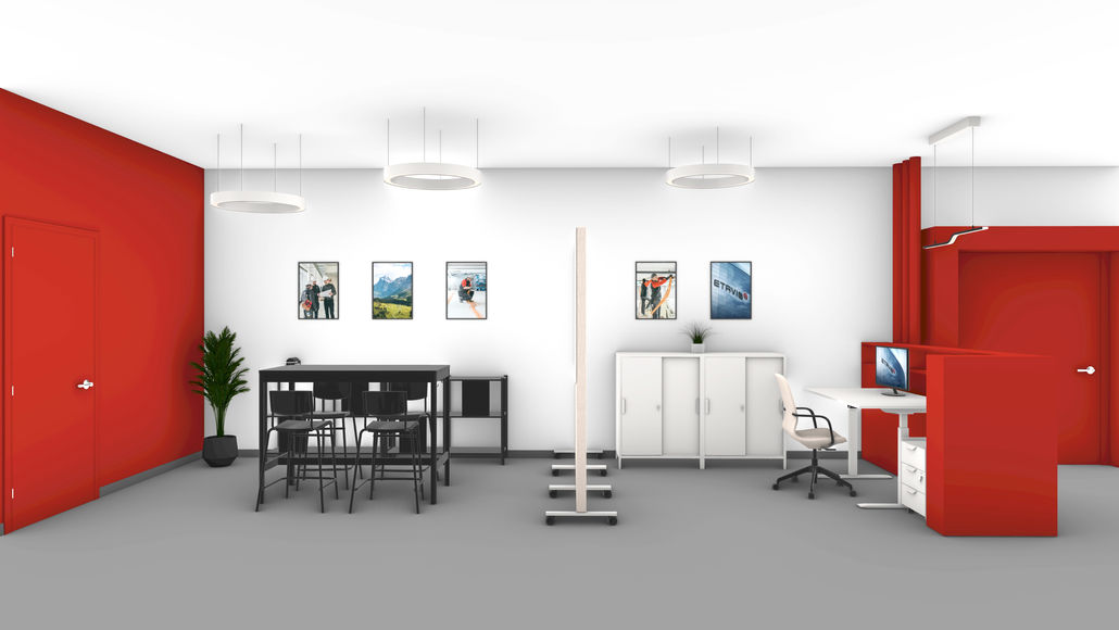 Nous avons travaillé sur un aménagement offrant deux espaces en un en les séparent à l'aide de panneaux acoustique amovibles. L'idée étant également de respecter la discrétion de l'espace d'accueil tout en maintenant une cafétéria généreuse aux employés.